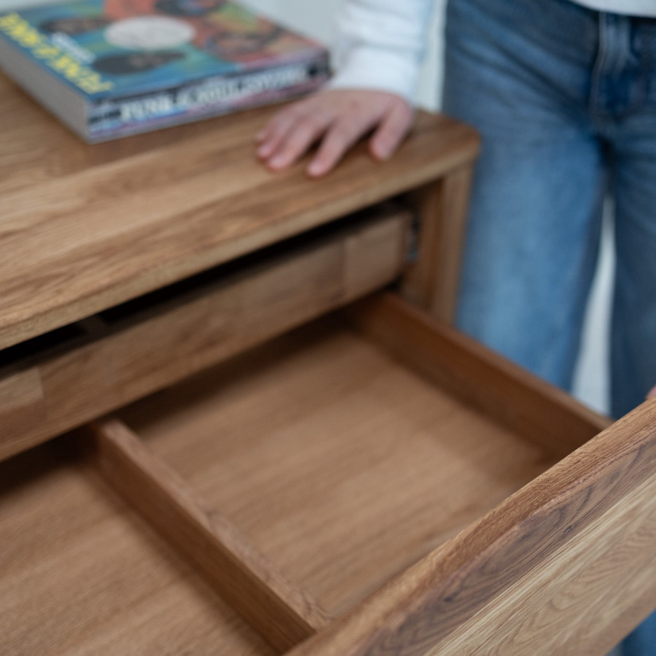 Fácil de limpiar con un paño suave o ligeramente húmedo. Evitar el contacto con productos químicos agresivos. Antes de usar las mesas, recomendamos cubrir la encimera con la cera para la madera, por lo que se forma una capa fina de protección contra la absorción de líquidos. Todos los demás muebles 1-2 veces al año deben tratarse con aceite de tung para proteger e hidratar la madera.