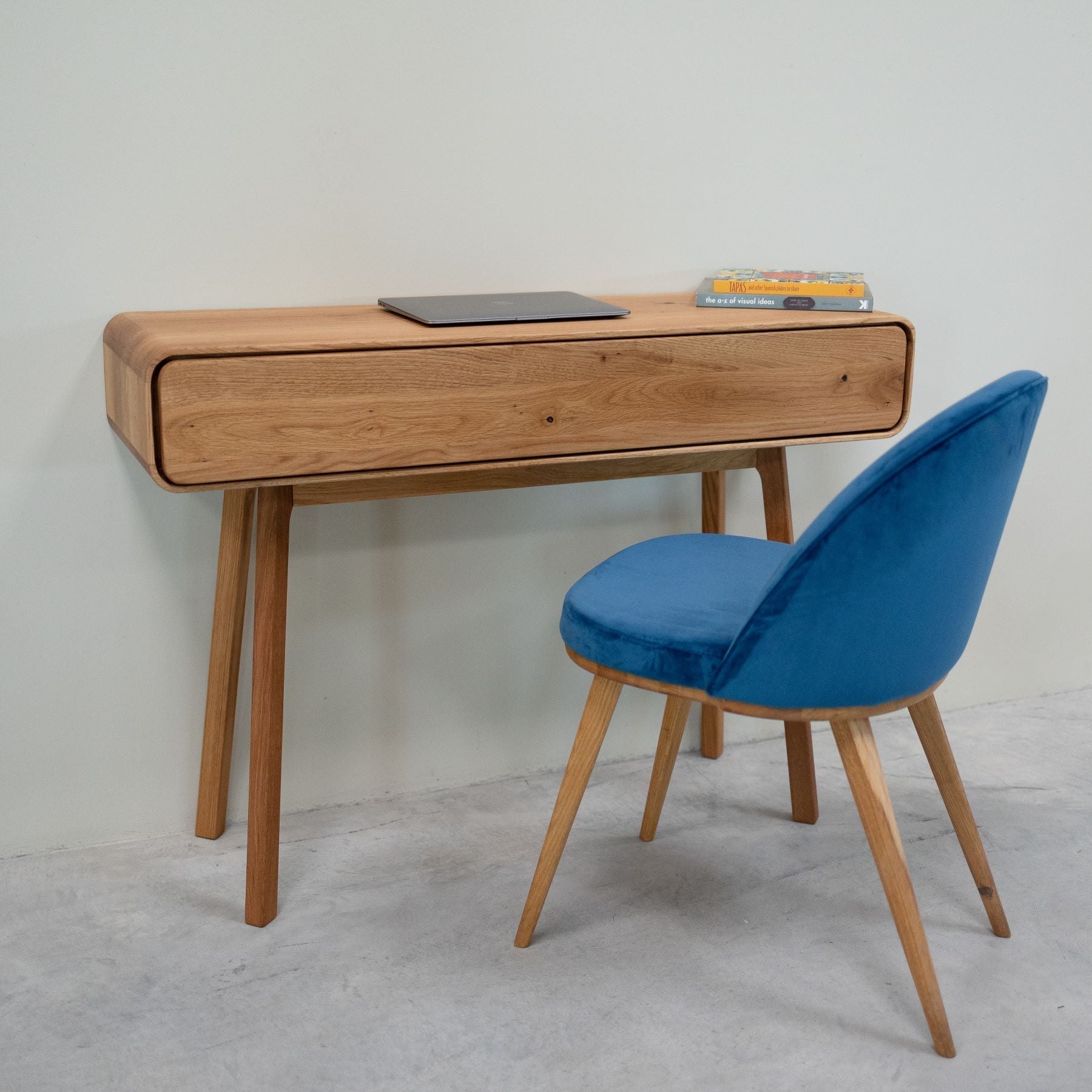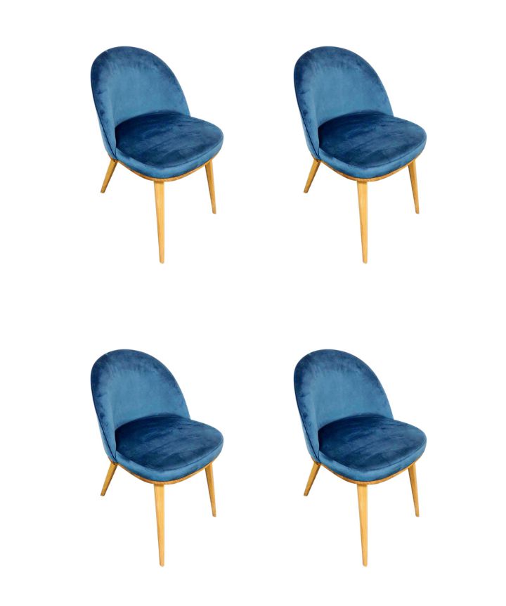 La silla "Clara" es una silla de curvas sinuosas y elegantes tapizada en terciopelo azulón. Sus curvas se adaptan bien al cuerpo ofreciendo comodidad a su ocupante. Es una silla robusta a la vez ya que está realizada en madera maciza de roble.