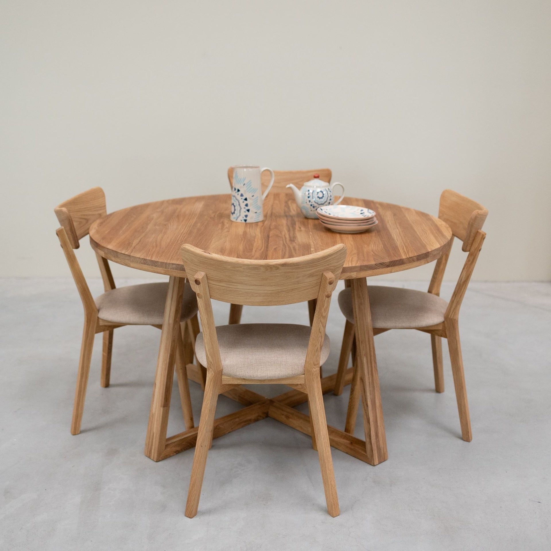 Material: Madera maciza de Roble en color natural, tapizado en beige.